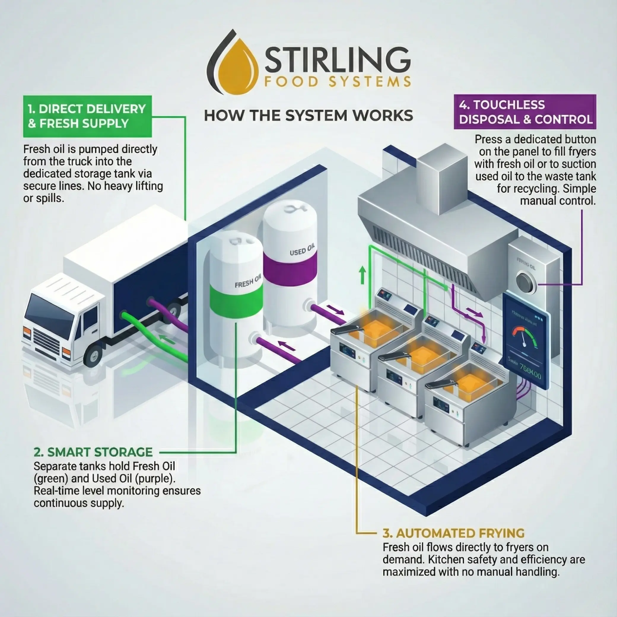 Imagine a closing shift where oil disposal takes seconds, not stressful hours. Your team flips a switch, the oil moves automatically, and the floors stay pristine while you track every drop. One quiet change to a closed loop system saves hours of labor weekly and extends oil life by 20%. This level of control makes the kitchen feel professional again.