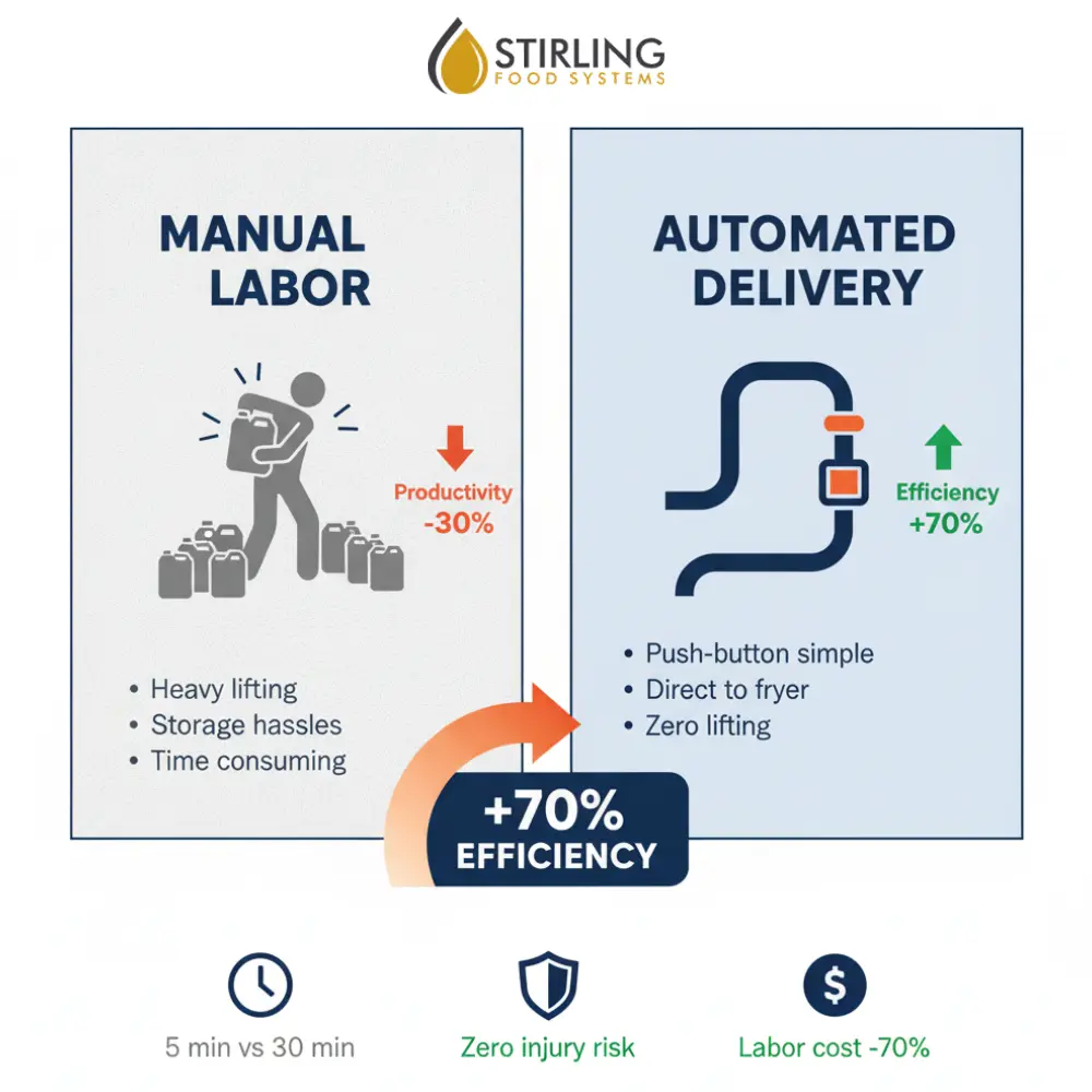 A closed loop setup that delivers fresh oil and evacuates used oil through exterior ports no jugs or hoses through the kitchen reducing labor, spills, and safety risk.