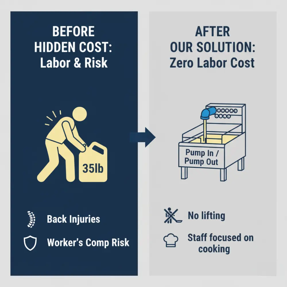 In a high volume kitchen, the most dangerous, labor intensive task is handling hot oil during changeouts. LFO+ and the pump in / pump out system automate this risk entirely. Carriers may view automated oil handling as a reduced burn risk posture; ask us about impacts on coverage and premiums.